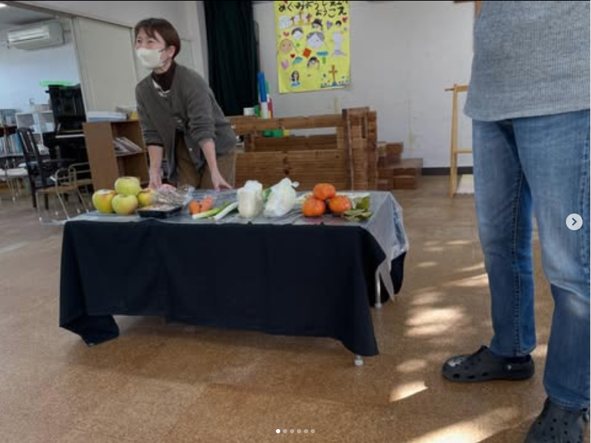 礼拝では「感謝(ありがとう)の気持ちを感じたり伝えたりすると幸せな気持ちになる」など大切なお話を聴き、その後みんなで持ち寄ったお野菜など年少さんはきのこを手でちぎり、年中、年長さんは包丁で大根やにんじん、ネギなど切りました。